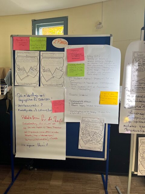 Die Teilnehmenden brachten ihre eigenen Themen ein und diskutierten engagiert über Schnittstellen, Übergänge und Lücken in der Versorgung, über Kooperationen zwischen Einrichtungen, Kommunikationswege sowie Unterstützungsangebote für Angehörige.